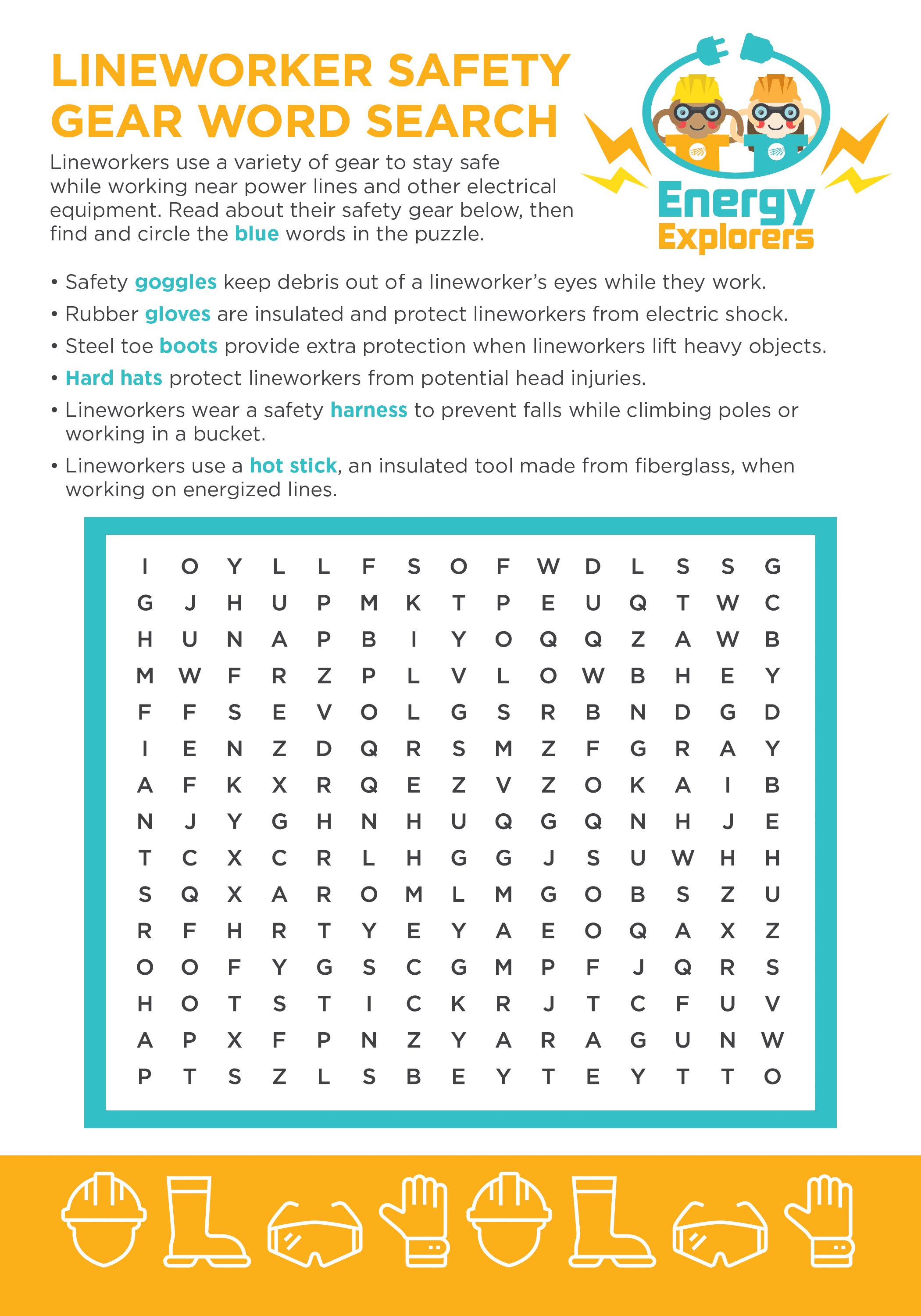 Storm Safety Crossword Electrical Safety Activity Power Generation Match Up Lineworker Gear Word Search Safe Electricity-For Kids